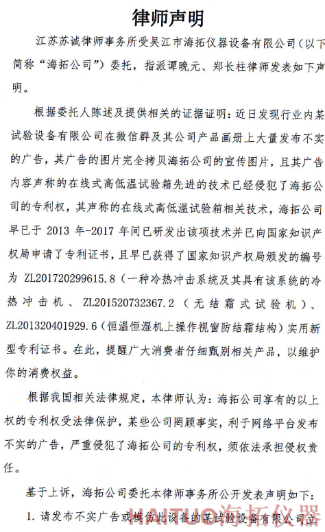海拓儀器律師聲明:反對侵權(quán)行為 維護(hù)公司和消費(fèi)者權(quán)益摘要:國內(nèi)試驗設(shè)備領(lǐng)先者吳江市海拓儀器設(shè)備有限公司委托律師事務(wù)所發(fā)布了律師聲明,該聲明指出,當(dāng)前市面上出現(xiàn)了產(chǎn)品專利侵犯海拓儀器權(quán)益,海拓儀器將以法律手段維護(hù)自身利益。該律師聲明要求某試驗設(shè)備有限公司立即停止侵權(quán)行為,扯下其在網(wǎng)絡(luò)平臺的相關(guān)廣告和宣傳畫冊并同時停止生產(chǎn)同款設(shè)備。如果該設(shè)備公司不聽勸解,海拓儀器將向人民法院依法起訴該公司侵權(quán)行為,以維護(hù)自身合法權(quán)益和維護(hù)客戶消費(fèi)權(quán)益,并建議廣大消費(fèi)者仔細(xì)甄別相關(guān)產(chǎn)品。? ? ? ?近日,吳江市海拓儀器設(shè)備有限公司委托律師事務(wù)所發(fā)布了律師聲明,該聲明指出,當(dāng)前市面上出現(xiàn)了產(chǎn)品專利侵犯海拓儀器權(quán)益,海拓儀器將以法律手段維護(hù)自身利益。??事件源起于海拓儀器發(fā)現(xiàn)市面上有同類設(shè)備公司通過完全拷貝海拓儀器產(chǎn)品宣傳圖片,在微信群及該公司產(chǎn)品畫冊上大量發(fā)布不實廣告。??聲明指出,該廣告聲稱的在線式高低溫試驗箱的技術(shù)侵犯了海拓儀器的專利權(quán),該產(chǎn)品專利由海拓儀器 -